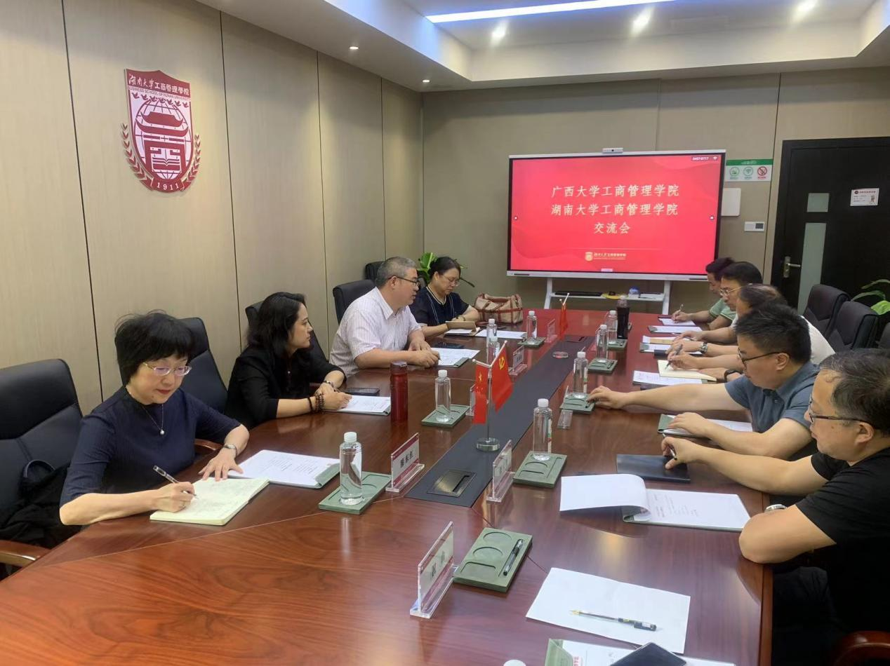 ,党委书记刘喜东及相关领导与朱帮助一行进行了深入交流,双方回顾了两校深厚渊源,就研究生国际化、专业学位论文质量提升、教师考核、文化建设等方面展开探讨。朱帮助院长指出两院有诸多相似之处,具备深度合作的基础和前景,希望进一步深入了解湖南大学麻豆a片