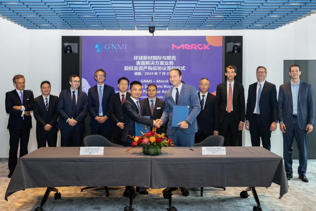 在德国并购项目签约仪式上环球新材国际与默克集团双方代表握手留念