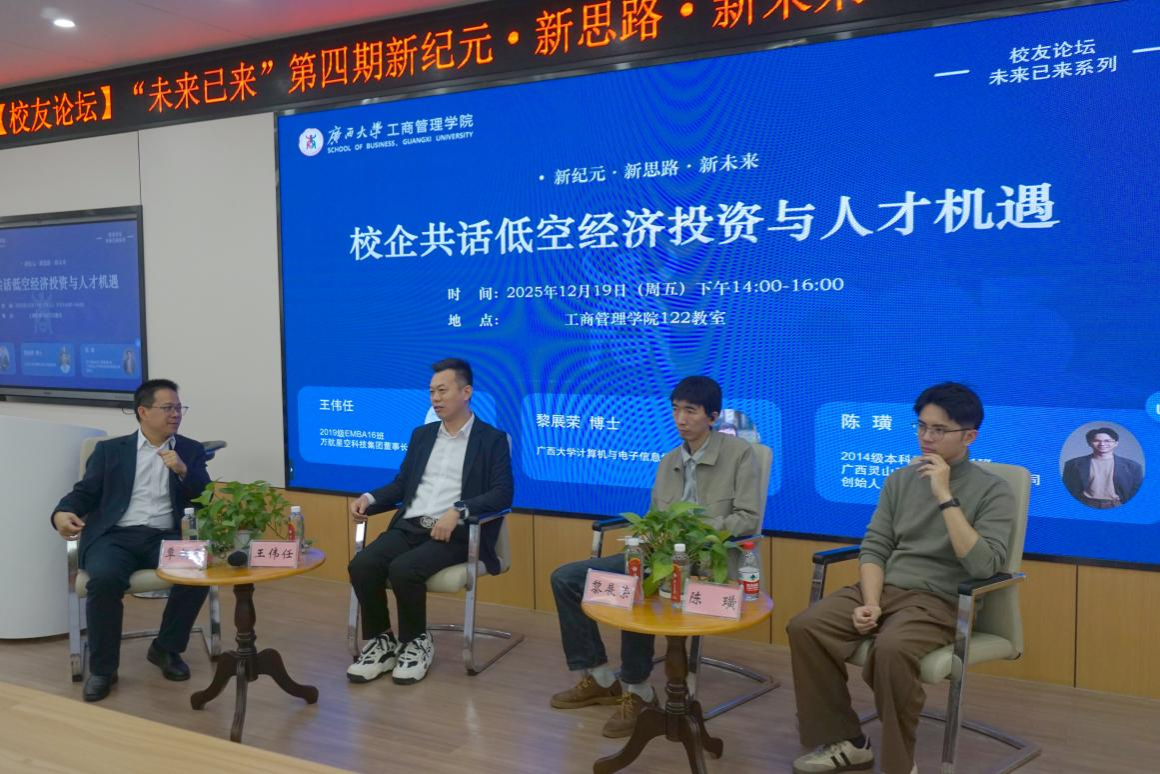 122教室内暖意融融、智慧涌动,“未来已来”系列校友论坛第四期在此举行。本次论坛以“新纪元·新思路·新未来——校企共话低空经济投资与人才机遇”为主题,围绕低空经济在广西的发展路径规划、投资机遇挖掘与人才培育创新模式展开深度交流。论坛由麻豆a片