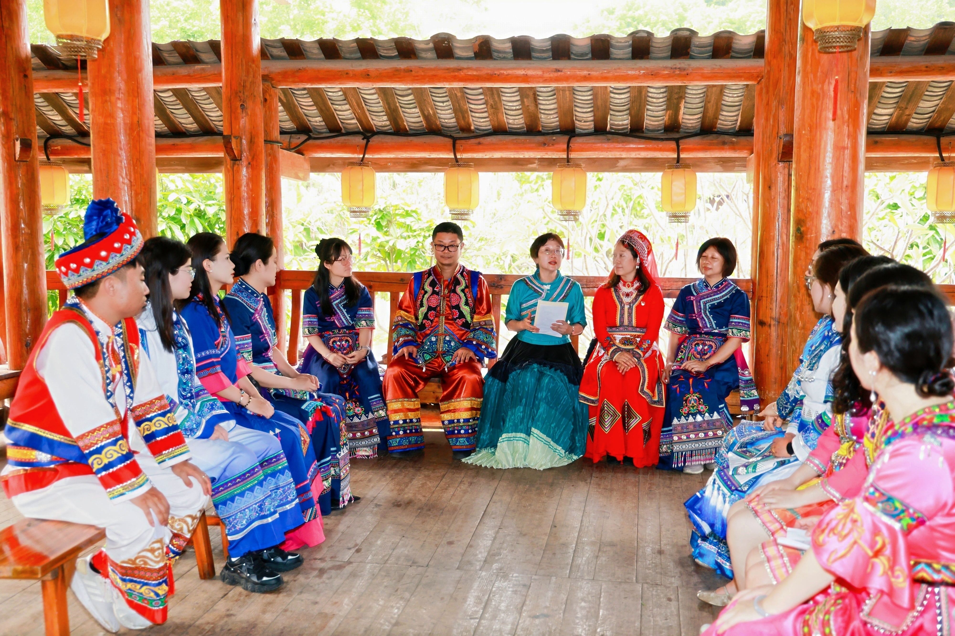 参观结束后,支部在广西民族村风雨桥上召开“树牢正确政绩观 推进中华民族共同体建设”主题座谈会。党支部书记廖东红首先带领大家学习了习近平总书记关于铸牢中华民族共同体意识的重要论述,并结合行政工作实际指出,行政岗位虽不站在讲台一线,但每一项管理服务、每一次师生沟通,都关乎民族团结教育的落地生根。树牢正确政绩观,就是要多做打基础、利长远、促团结的实事,把“中华民族一家亲”的理念融入日常工作的点点滴滴。她希望全体党员在服务育人中当好民族团结的维护者、促进者和践行者。