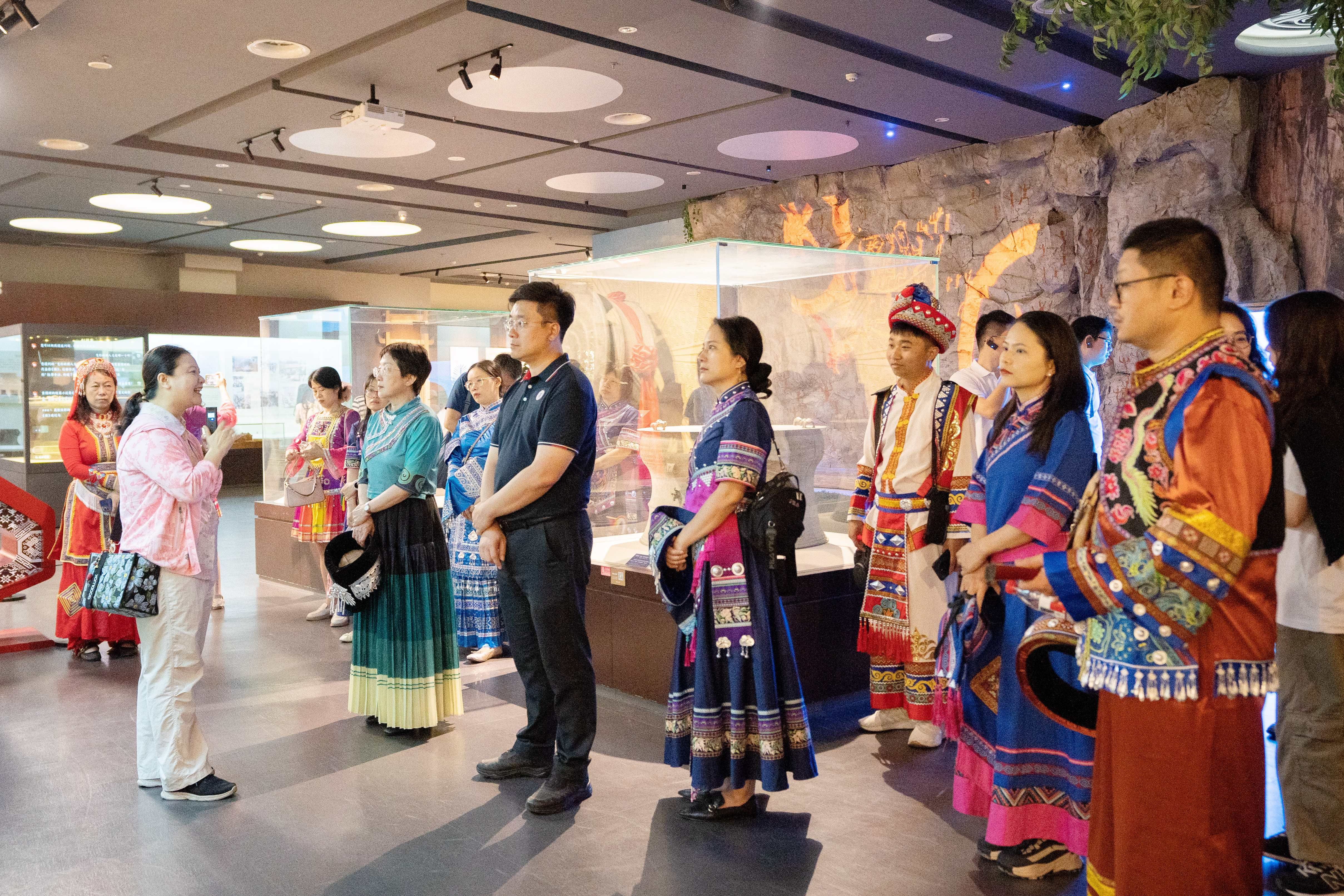 在讲解员的带领下,党员同志们依次参观了花山岩画展区、铜鼓文化展厅、霓裳羽衣展厅等。大家驻足于古岩画前,惊叹于先民的艺术智慧;流连于铜鼓阵列间,聆听穿越时空的文明回响;凝望于五彩织锦旁,感受各民族指尖上的匠心传承。从古老的传说到现实的生活,从传统的习俗到现代的变迁,大家深刻认识到各民族在中华大地上相互依存、共同发展的紧密联系,进一步增强了对中华民族大家庭的认同感和归属感。