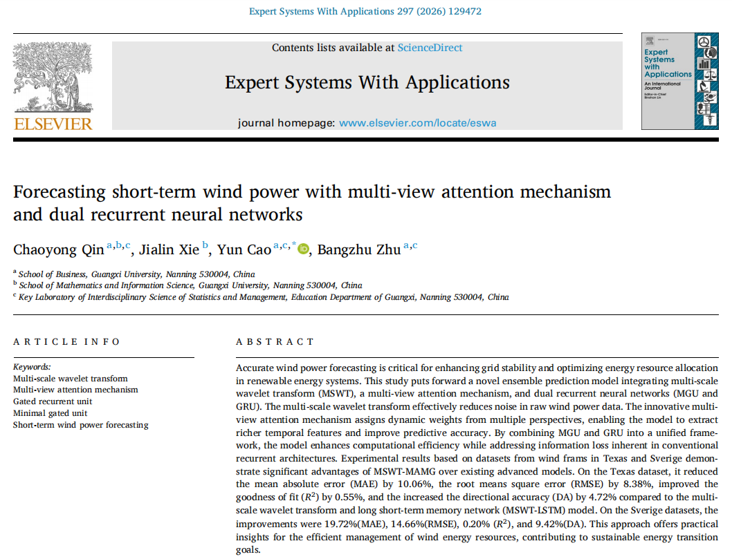 覃朝勇教授团队在能源预测领域研究取得重要进展,研究成果《Forecasting short-term wind power with multi-view attention mechanism and dual recurrent neural networks》在人工智能与能源智能应用领域国际权威期刊《Expert Systems With Applications》上发表,麻豆a片