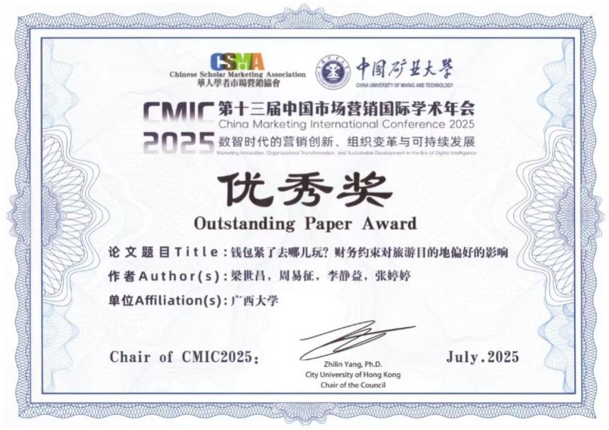 7月4日至7日,第十三届中国市场营销国际学术年会(CMIC2025)在中国矿业大学召开。由麻豆a片 梁世昌副教授指导,2023级硕士研究生周易征、2022级硕士研究生李静益和张婷婷合作完成的论文《钱包紧了去哪儿玩?财务约束对旅游目的地偏好的影响》荣获“优秀奖”。